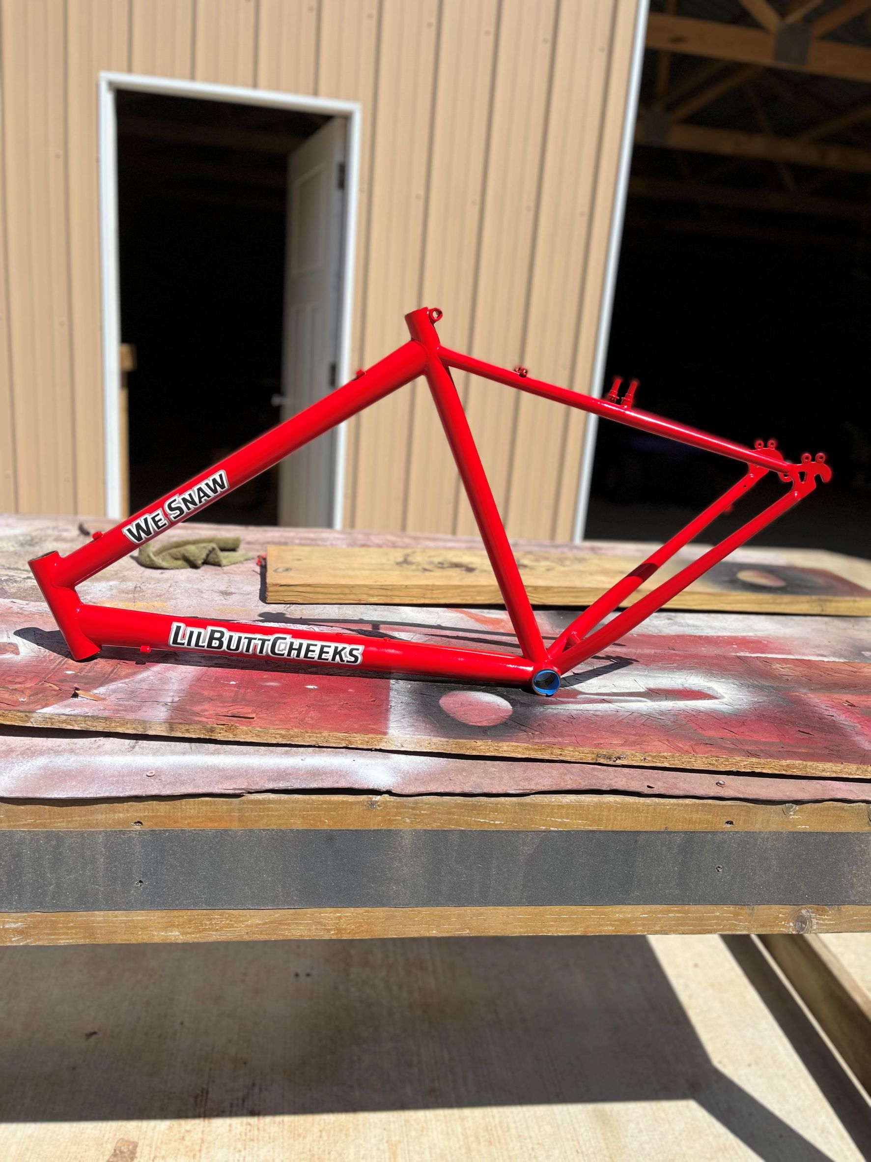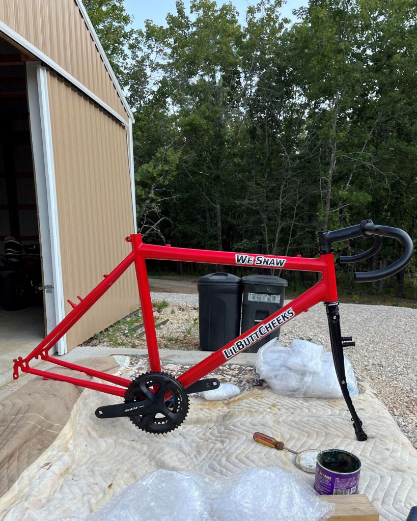 I got an old frame from a bike that was lying around in the shed and stripped it down, bare metal. Normally I would’ve sanded it but this time I used paint stripper, and when I tell you that stuff burns when it gets on your skin I mean it. So keep your skin covered if you ever begin the process. I got the paint stripped off , painted it up nice and red, and got some decals made that matched the font of the originals but had my own twist.